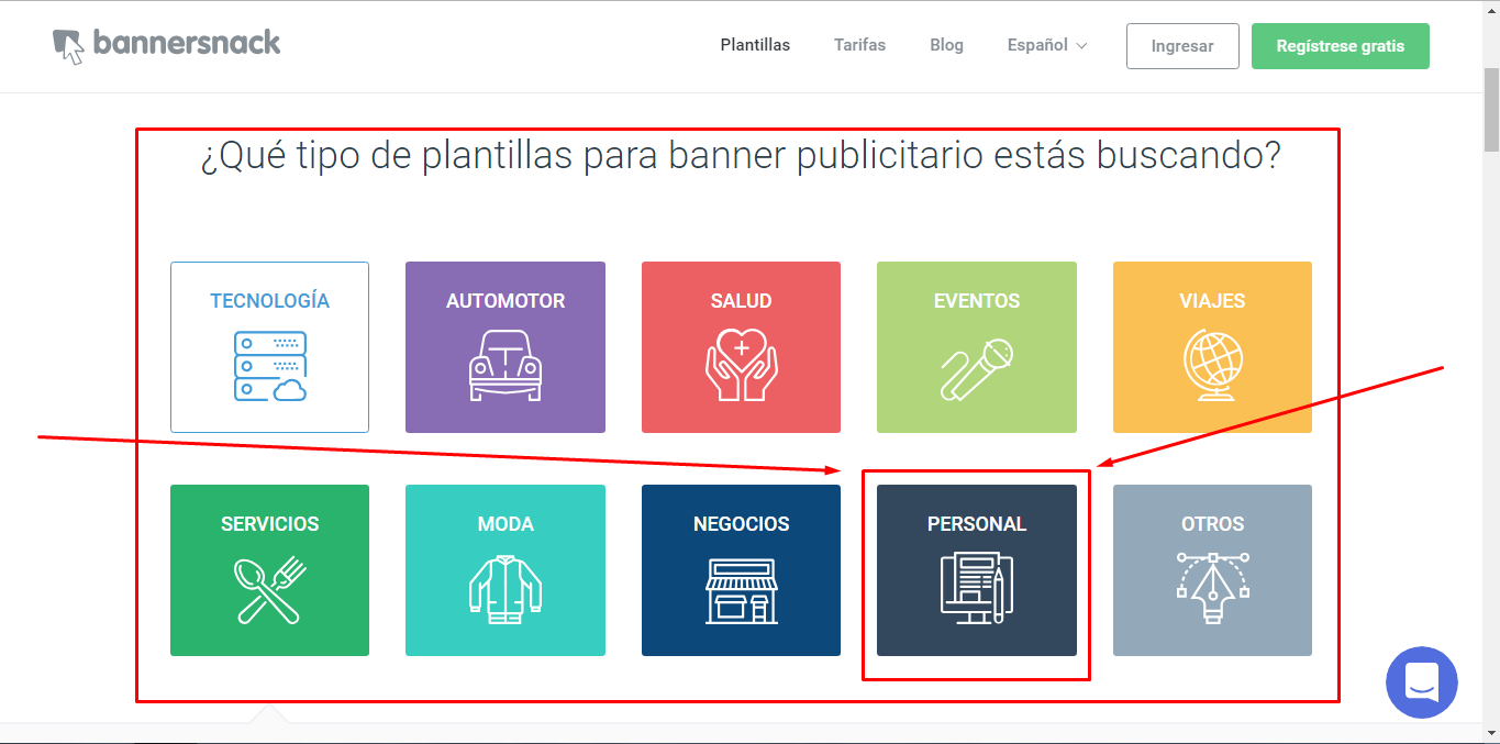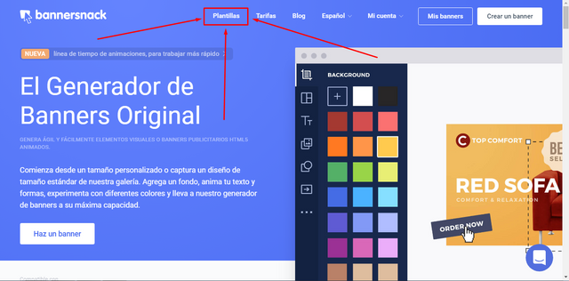 ►PRIMERO: Desde la página inicial de "Bannersnack", diríjase al menú principal en la parte superior izquierda, en la opción que dice: "Plantillas" y haga clic allí (ver recuadro, señalado con flechas):