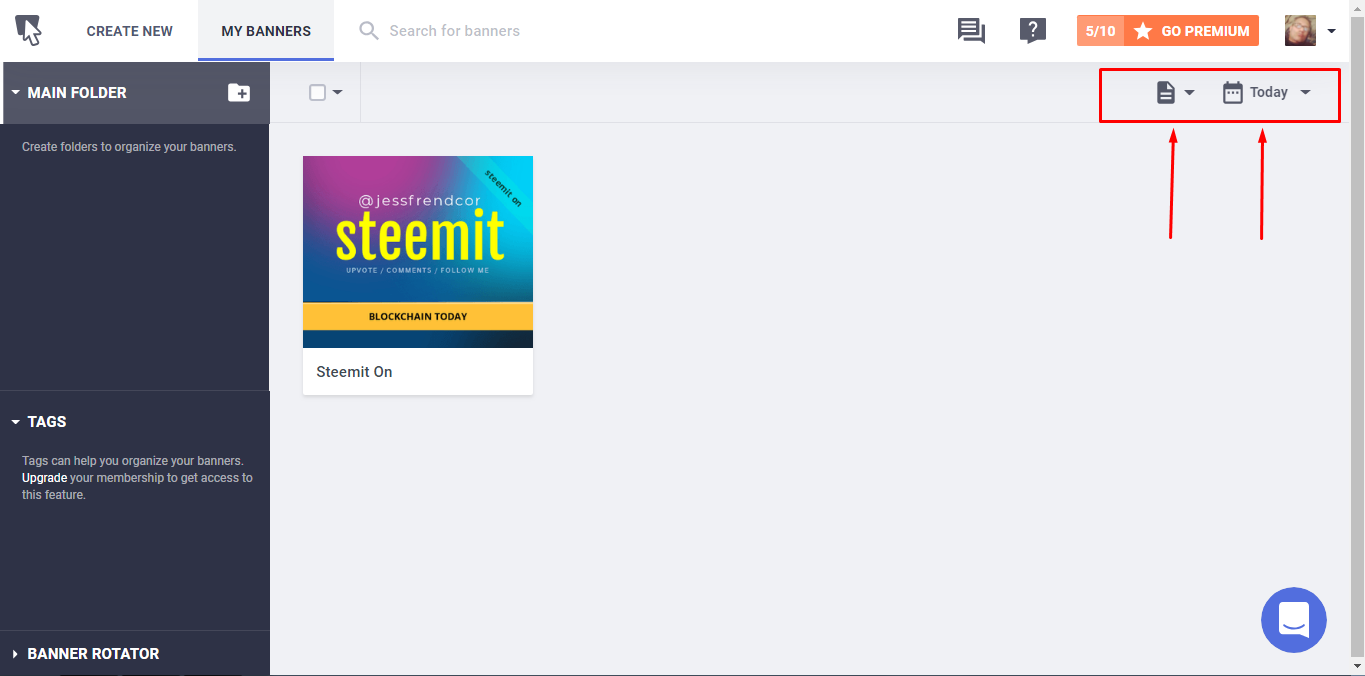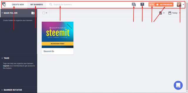 ►SÉPTIMO: Se precisa acotar además, que en la parte superior de la pantalla, se encuentran las alternativas para: 1.- Crear una nueva imagen; 2.- Ver los banners creados (re-editados); 3.- Buscar uno o más banners por el nombre de archivo; 4.- Calificar la plataforma digital ("Bannersnack"); 5.- Opción de Ayuda; 6.- Cantidad de banners creados (re-editados) y por crear (re-editar); 6.- Acceso a la versión "Premium"; y 7.- Perfil de usuario; entre otras posibilidades como buscar banners por tipo y fecha (ver la imagen con el recuadro señalado con flechas):