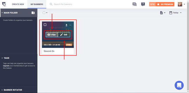 ►OCTAVO: Así mismo, puede descargar el banners para utilizarlo en cualquier otra plataforma electrónica, y el sistema o interfaz, le permite hacerlo en varios formatos, tales como: 1.- JPG; 2.- PNG; 3.- GIF; entre otros. Para ello debe clicar en la opción "View"...o copiar el código de la imagen; y en paralelo, se puede reeditar la imagen, al clicar en "Edit" (ver la imagen, en el recuadro señalado con flechas):
