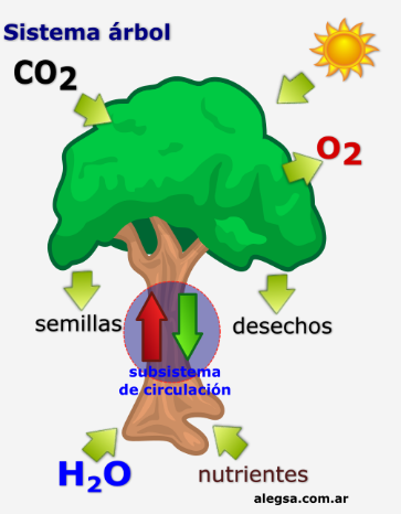 La imagen refleja el árbol como un sistema, y sus siete elementos organizados y a su vez interactuando entre sí, permitiendo la relación con el medio ambiente, siendo ello una característica del sistema abierto.