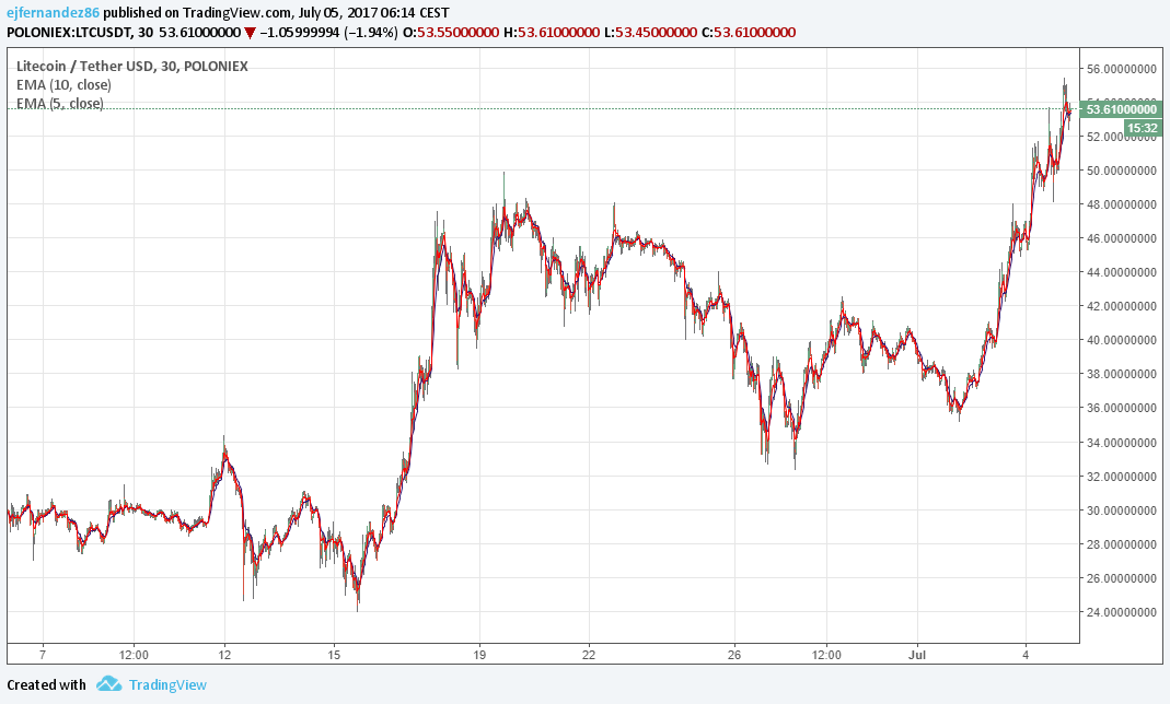 Apenas al inicio de mes el Litecoin ha tenido una subida importante la cual es posible acerque su precio a los 70$ teniendo en cuenta que hasta hace apenas unos días su valor llego a rondar los 21$. Es una de las monedas sub-valoradas de la cual se espera un crecimiento enorme en el 2017.