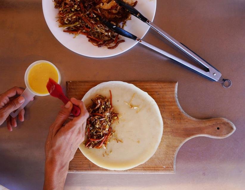 Colocar el relleno en un extremo de la crepe y untar los bordes con huevo.
