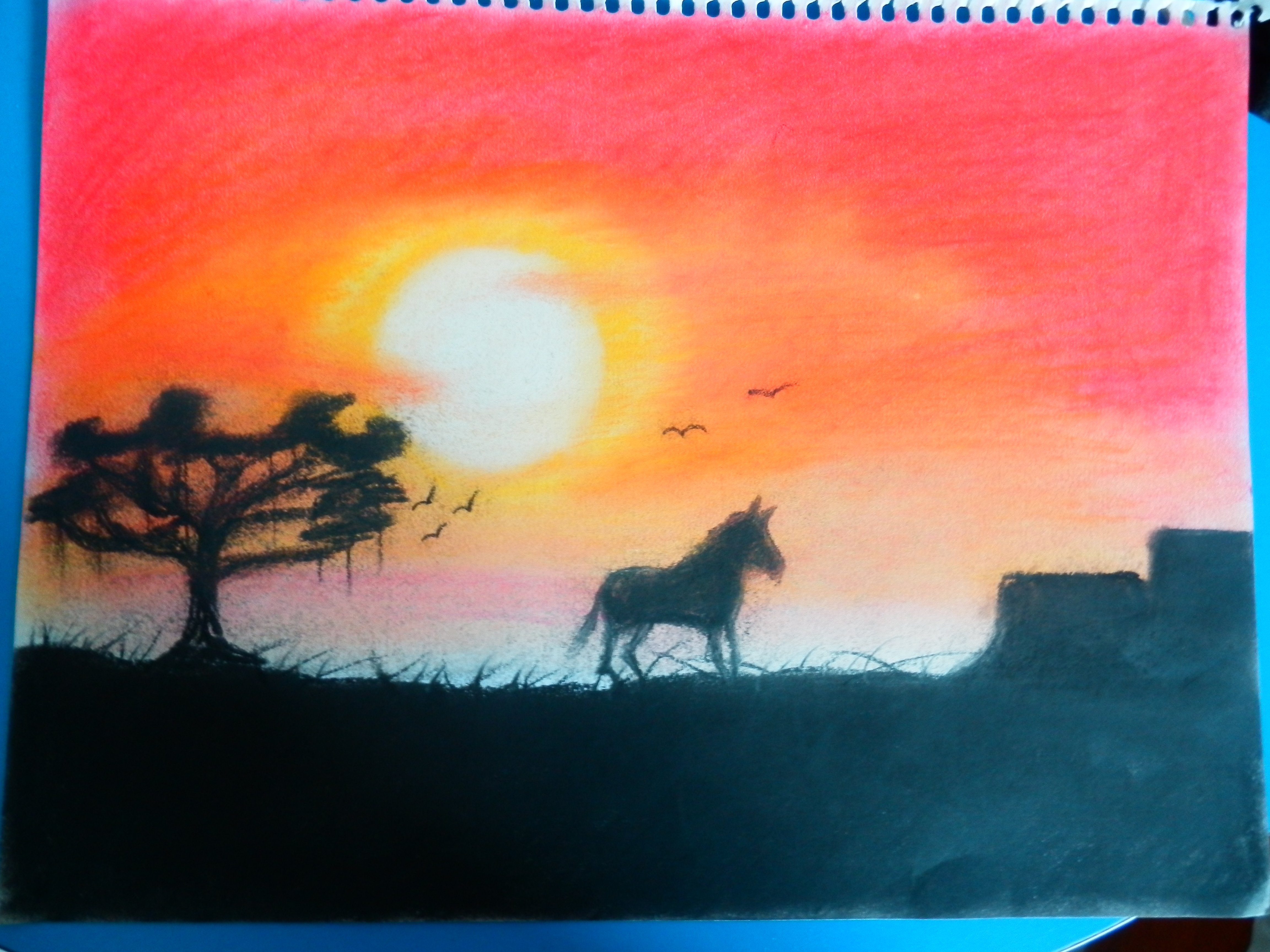 Hola Steemians hoy les traigo un dibujo que representa un caballo en la sabana, hacer este dibujo fue algo difícil ya que tuve que estar varias horas retocando los colores amarillo, naranja y rojo, para que diera esa sensacion de atardecer (que a mi parecer lo logré) y hacer las sombras del caballo, el árbol y el sol.
