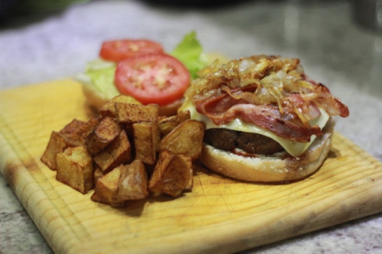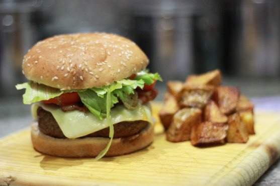Deliciosa hamburguesa de 200 gr de carne de res, cebolla caramelizada, lechuga, tomate, tocineta y queso mozarela, con un extra de papas fritas.