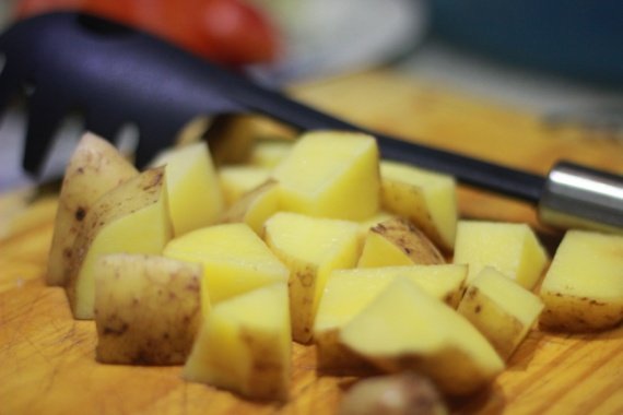 Procedemos a lavar bien las papas y las cortamos en cuadritos, para luego sofreírlas.
