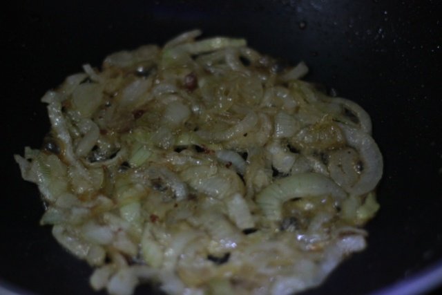 Cortamos la cebolla en rodajas, y la llevamos a un sartén de teflón con un chorrito de aceite, esperamos unos 3 minutos y le agregamos unas tres cucharadas de azúcar y lo dejamos cocinando a fuego bajo hasta que la cebolla dore un poco junto con la azúcar, cuando dore le agregamos un chorrito de agua para que el caramelo de la azúcar no quede duro.