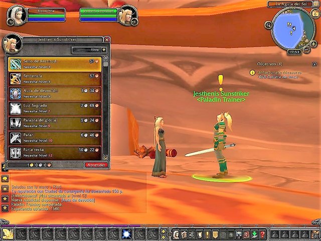 Antes de adentrarme a mi segunda misión, me di una pasada por el instructor de artes de Paladín o como yo le suelo decir, “PapirukiMasterofPaladin” para aprender un par de trucos nuevos, hablando con él, me llevo a un campo de concentración y aprendizaje, no me costó mucho aprender estas nuevas habilidades, en realidad desde chica he sido muy rápida y eficaz para la batalla con mi espada.