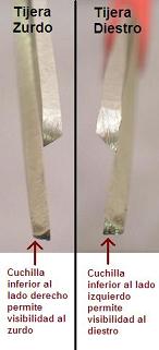 Aquí puede apreciarse la diferencia entre una tijera para zurdos, y una convencional: