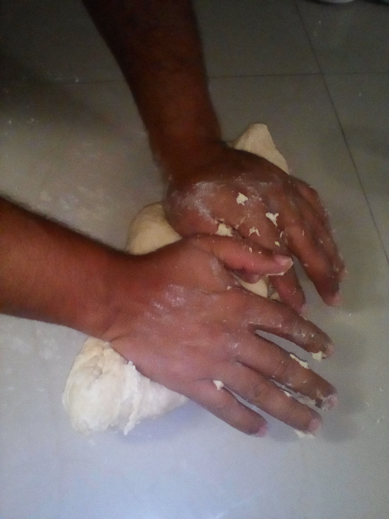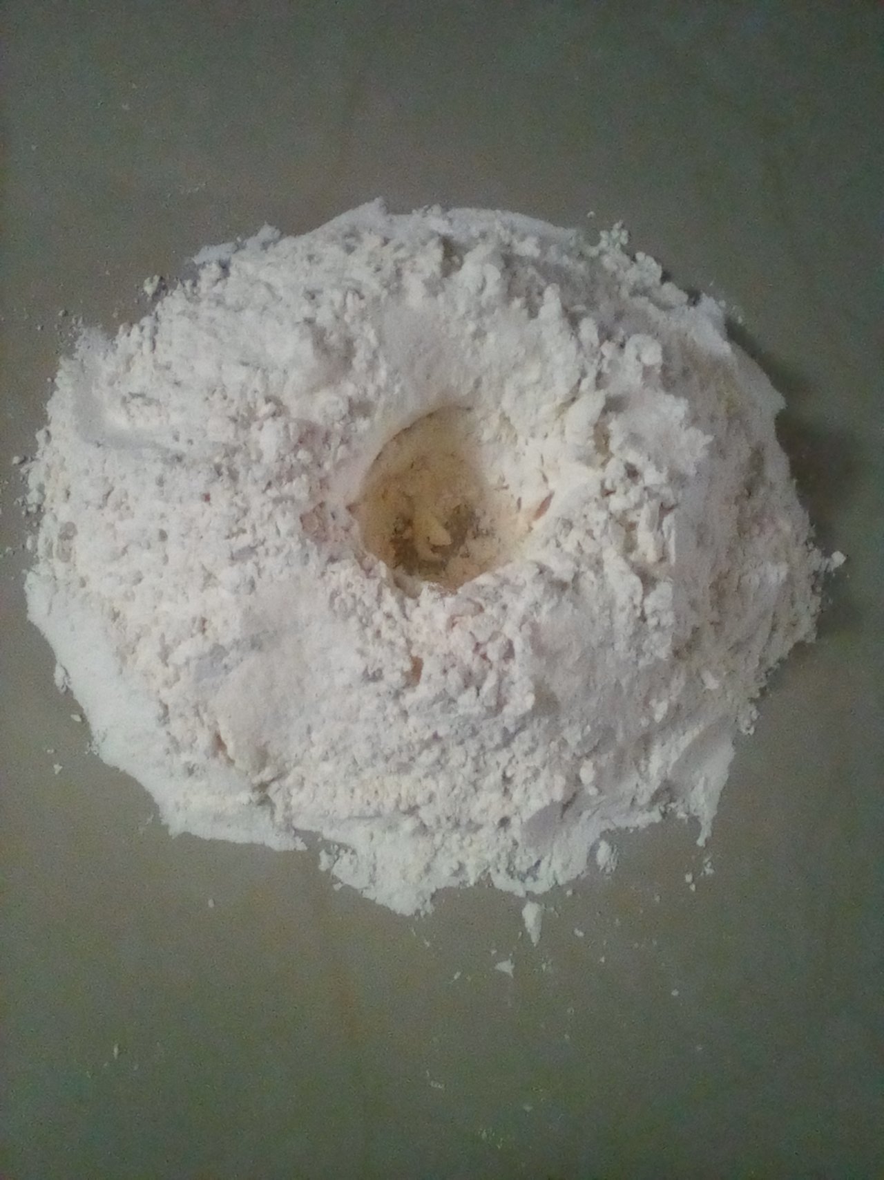 En un mesón limpio coloca la harina cernida con la sal y haces una forma de volcán.
