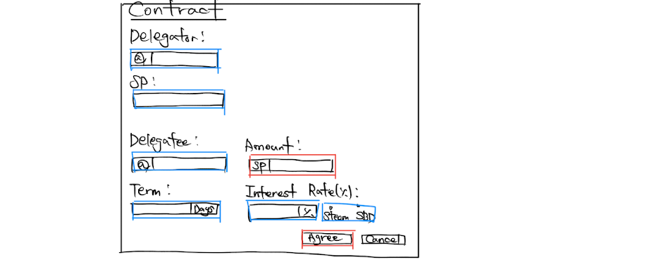 #3. Delegatee - Processing을 누르면, 아래와 같은 Contract(계약서)가 뜬다. 파란 부분은 고정이며, Amount는 Delegator가 Market에 올려놓은 SP에 한해 조정할 수 있다. Agree 누르면, 다시 Delegator에게 계약서가 넘어간다.