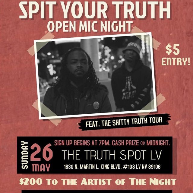 #SpitYourTruth #OpenMicNight #LasVegas #TheShittyTruthTour #Poetry #SpokenWord #HipHop #Rap #Singers #Musicians #CashPrize #TheTruthSpotLV #share2steem