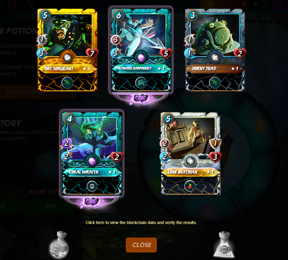 The only decent thing I got from the chests was a grand total of 1.3k DEC and a kraken. I even had potions on and I didn't get a gold foil :(. After being depressed by what cards I got, I decided I should go open some packs. So I bought packs from Monstermarket (shoutout to reazuliqbal and zaku for creating such a great service! Be sure to check them out!) to see if my luck would get better. Let's check out what I got!