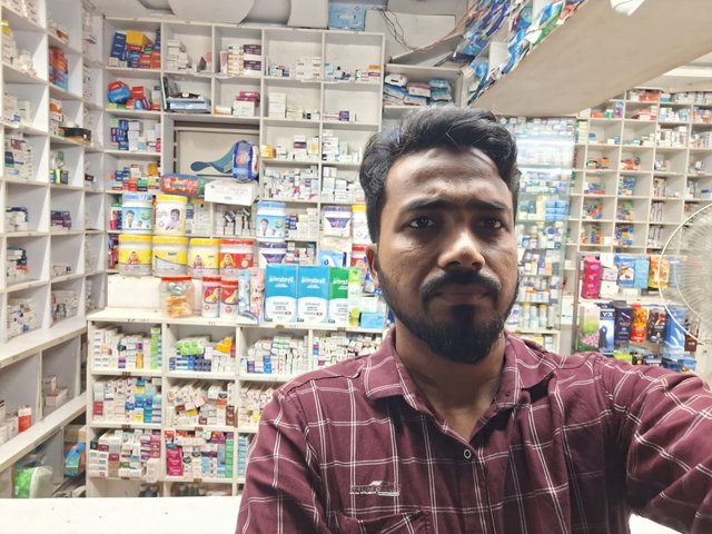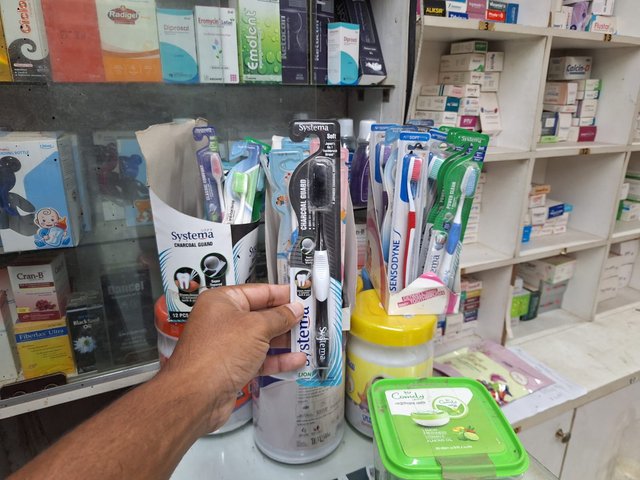 I left home in the evening and I have to iron the clothes I washed in the last two days and I have to take some medicine. I let the clothes be ironed and went to the pharmacy and bought a brush, some medicine and saline. I took some pictures with the permission of the manager of the pharmacy and talked to him for some time.