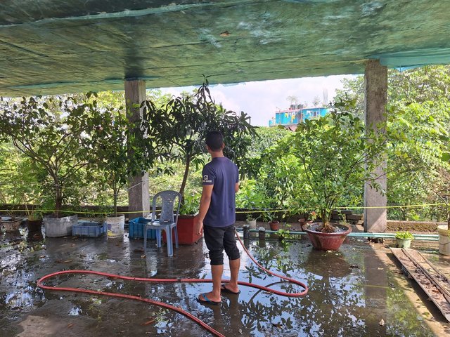 I am washing some of my clothes today too which I will take with me. Since I have a 5-day trip, I need to take more clothes. I washed the clothes and went to the roof to dry them. Shaheen is taking care of the plants on the roof. First, he removes the grass in the tub at the base of the plants and then he waters them. I spent some time with him.