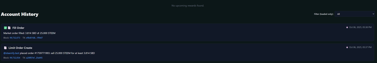 Additionally, users can view all their activities on the custom-built SteemExplorer, providing a complete overview of account transactions, trading history, and more.