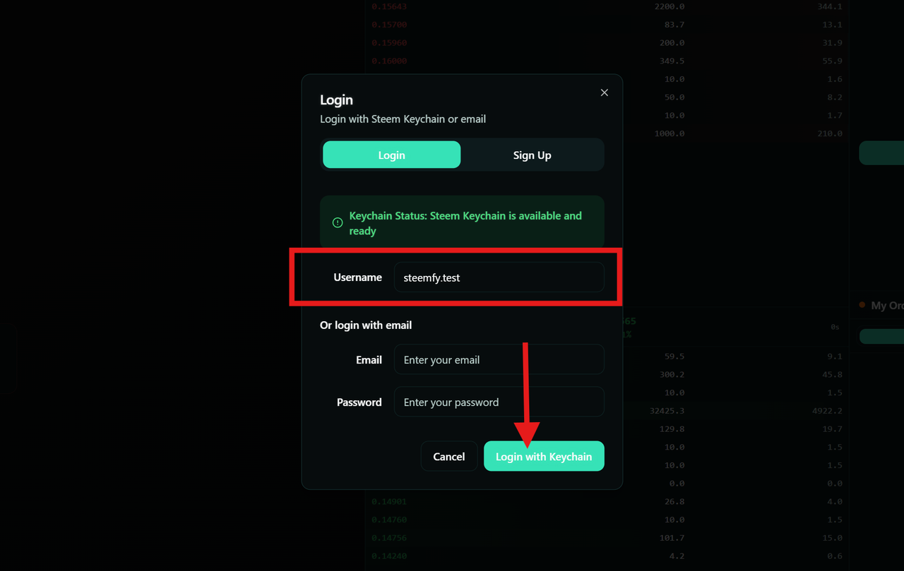 You can now trade on SteemDEX by logging in either with Steem Keychain or using your email and password. Now let's demonstrate a trade by connecting Steemit account via Keychain.