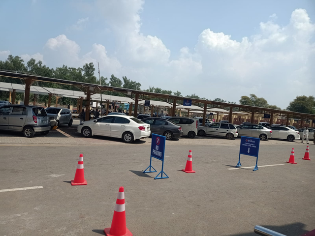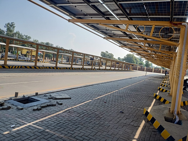A parking lot has been built in front of Imtiaz Mega Mall, and they have installed solar panels on top of this parking lot. The advantage of solar panels is that, firstly, they provide electricity, thus saving on the electricity bill. Secondly, this parking lot provides shade. All the vehicles are parked in the shade below, so there is a wide and open parking lot where all types of vehicles can park.