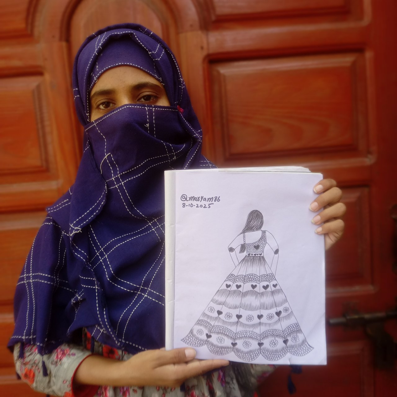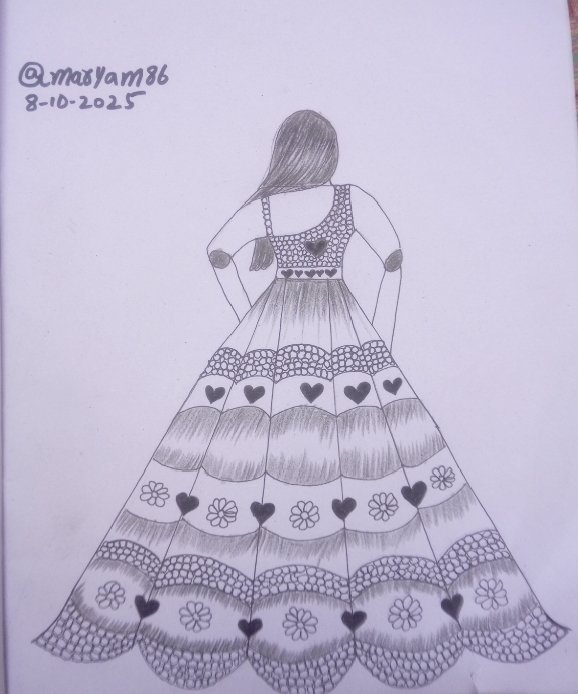 Finally.my drawing is almost complete. There is a little work left. On the top of the kurti, I made a round circle. In the middle, I made a small heart. which I filled with black color. I colored the hair black.and on the side between the arms, I made round circles above the elbows.