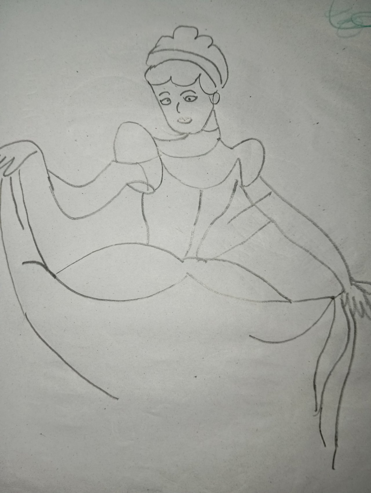 In the second step I drew upper part of Cinderella her beautiful maksi long hand .she catches her maksi with hand .