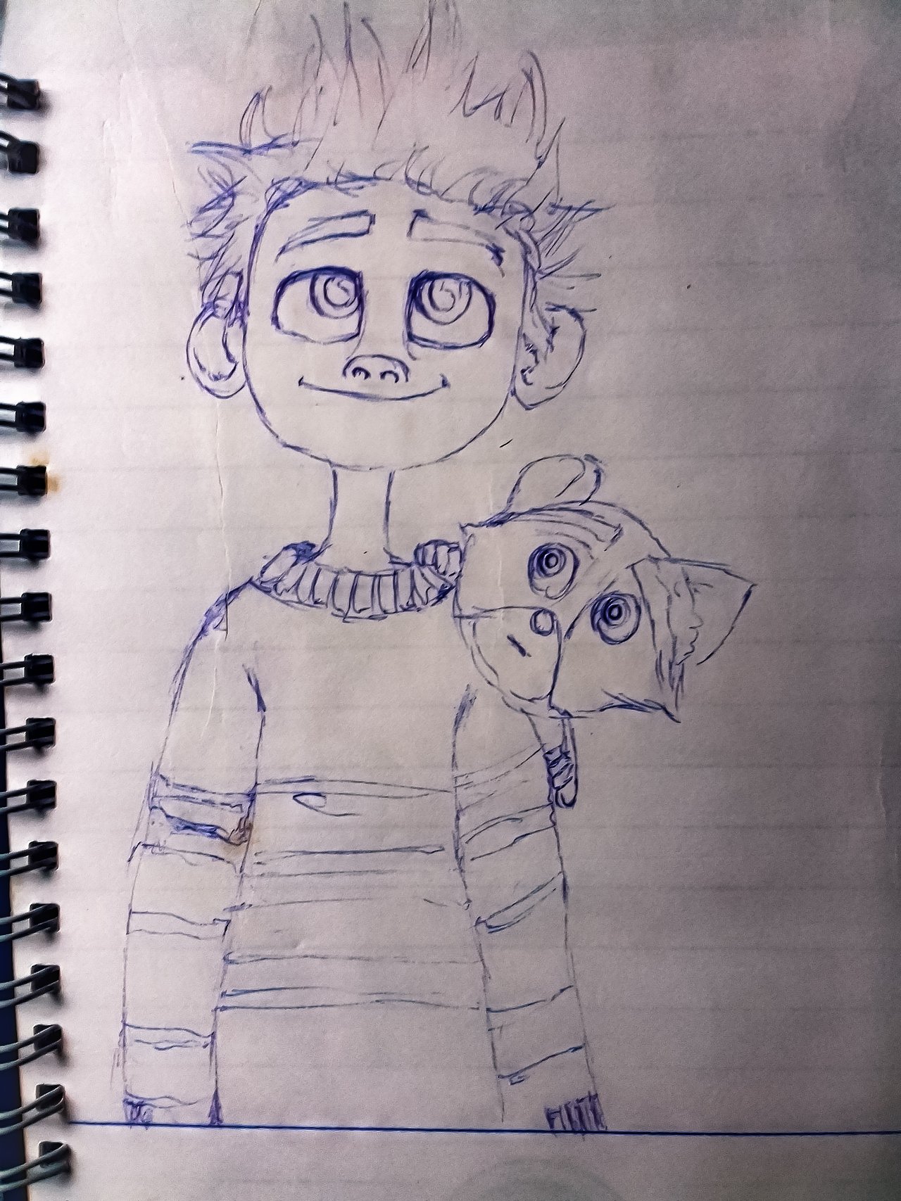 So, made a drawing of a cartoon boy with a squirrel as his pet.