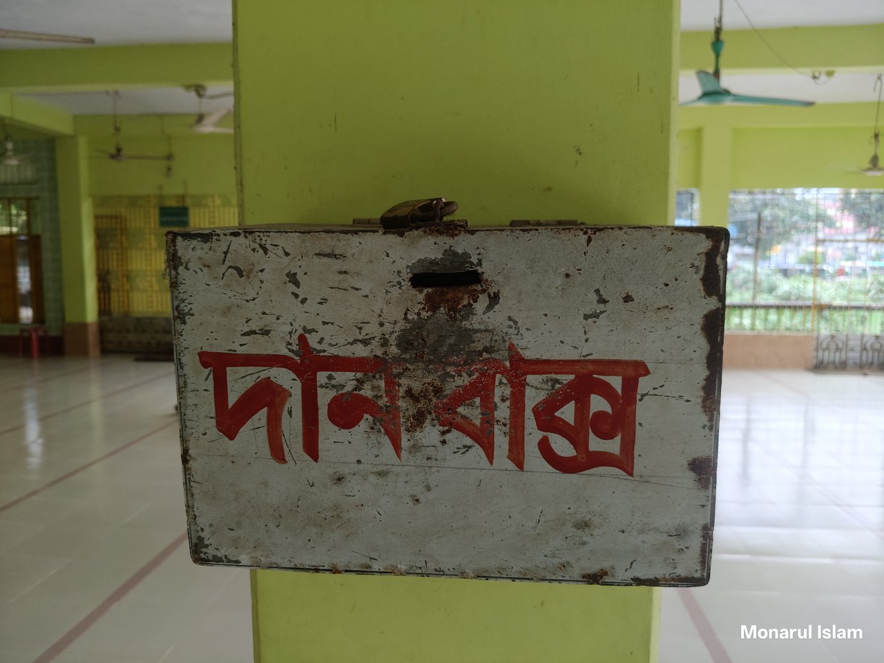 Let's see inside the mosque, there are many things inside the mosque but it will not be possible to show everything, I will show as much as possible, InshaAllah. When I entered the mosque, I noticed that there was a prayer for entering the mosque drawn on my head. After entering, I saw a donation box in front of my eyes, in which the worshippers donate money for the development of the mosque. And I saw a few mugs next to the wall, these mugs are basically left after every obligatory prayer and after the Friday prayer and some money is collected through this.