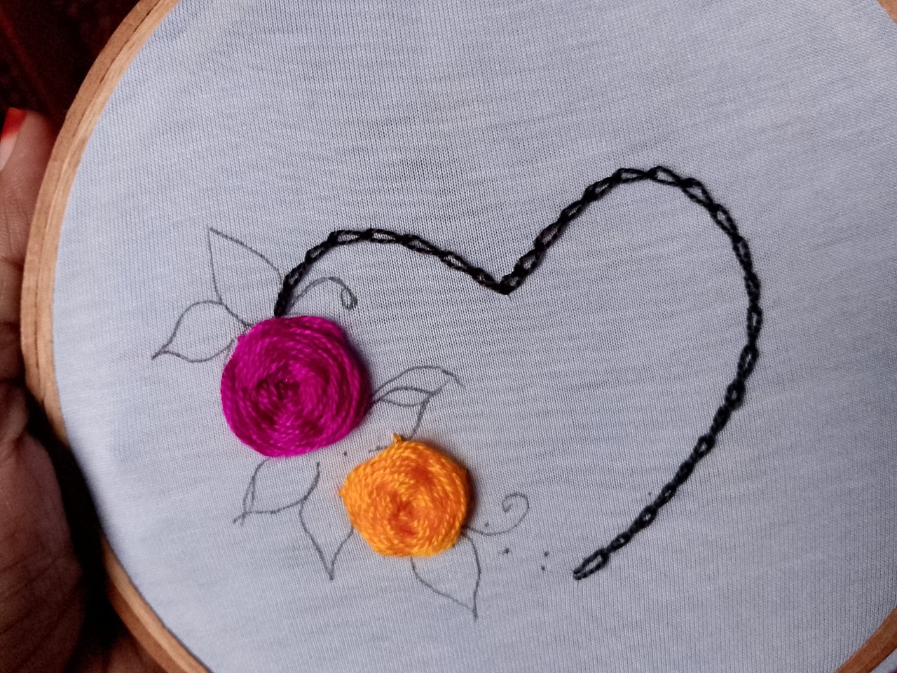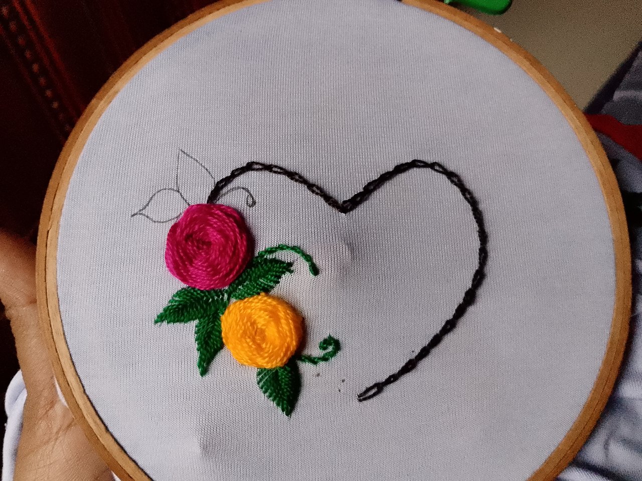 Finally, I embroidered the upper leaves in the same way. Then, at the lower part of the heart shape on the left side, I finished the work using black thread.