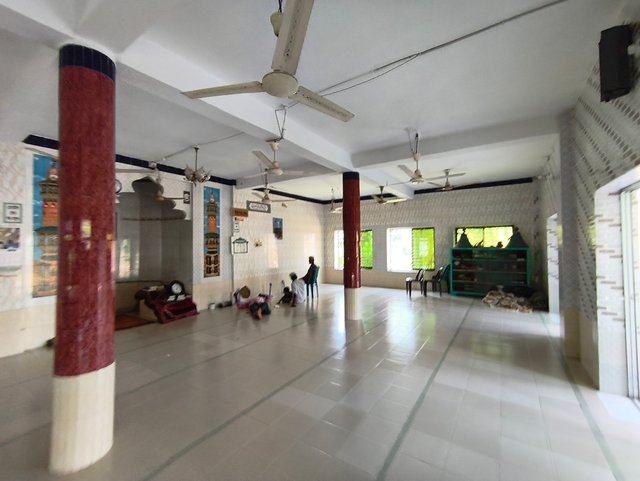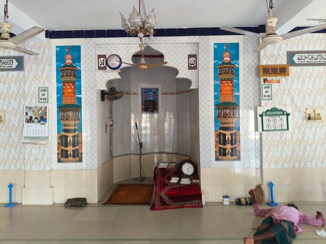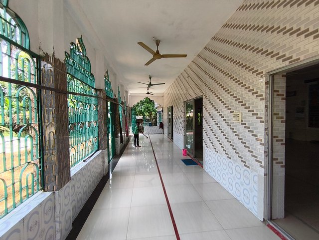 I entered through one door and saw the environment inside the mosque and took a photograph of the environment inside. I saw many people inside the mosque. There were a total of four rows for praying inside the mosque and two rows on the balcony outside. There were many fans inside and two speakers on both sides.