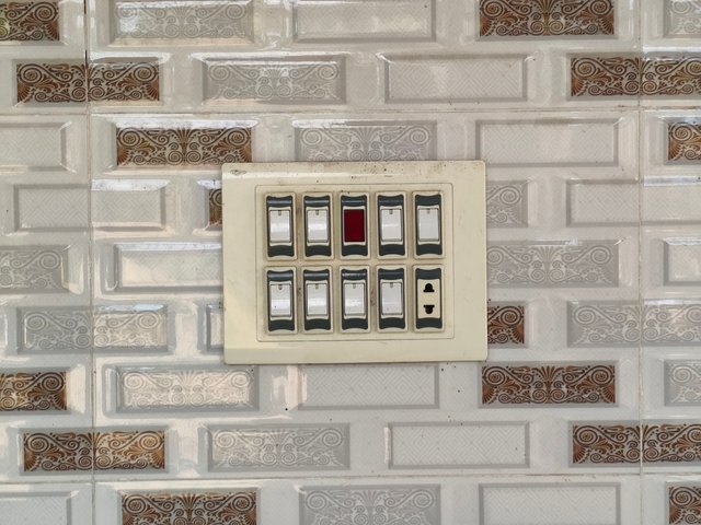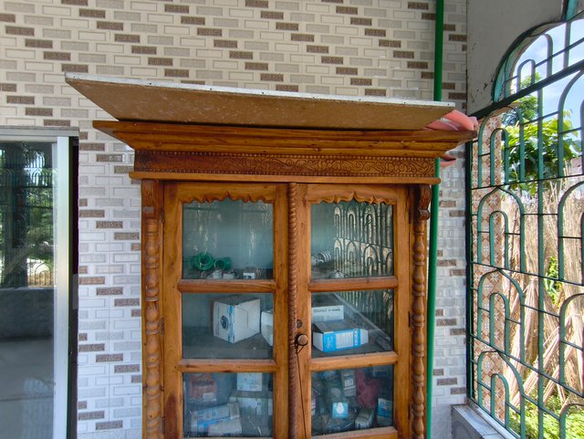 There was a fan and a switch on the balcony of the mosque. I saw a cupboard on one side of the balcony. I saw various kinds of useful things kept in the cupboard. I took a photograph of the cupboard.