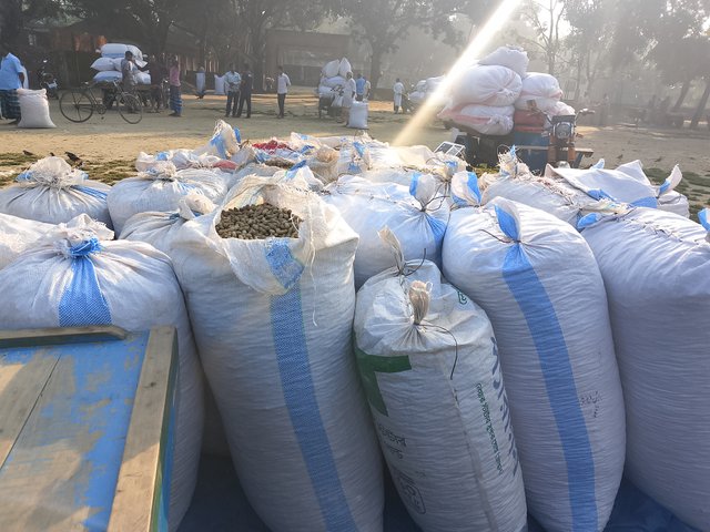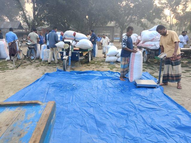 Upon arriving at the hat, I saw many people selling nuts in the morning and buying some nuts. After going to Amr, I started the nuts. Rabiyal uncle and Jatis Dada are weighing sacks on the digital scale. The weight of a sack here is 5 kg to 5 kg.