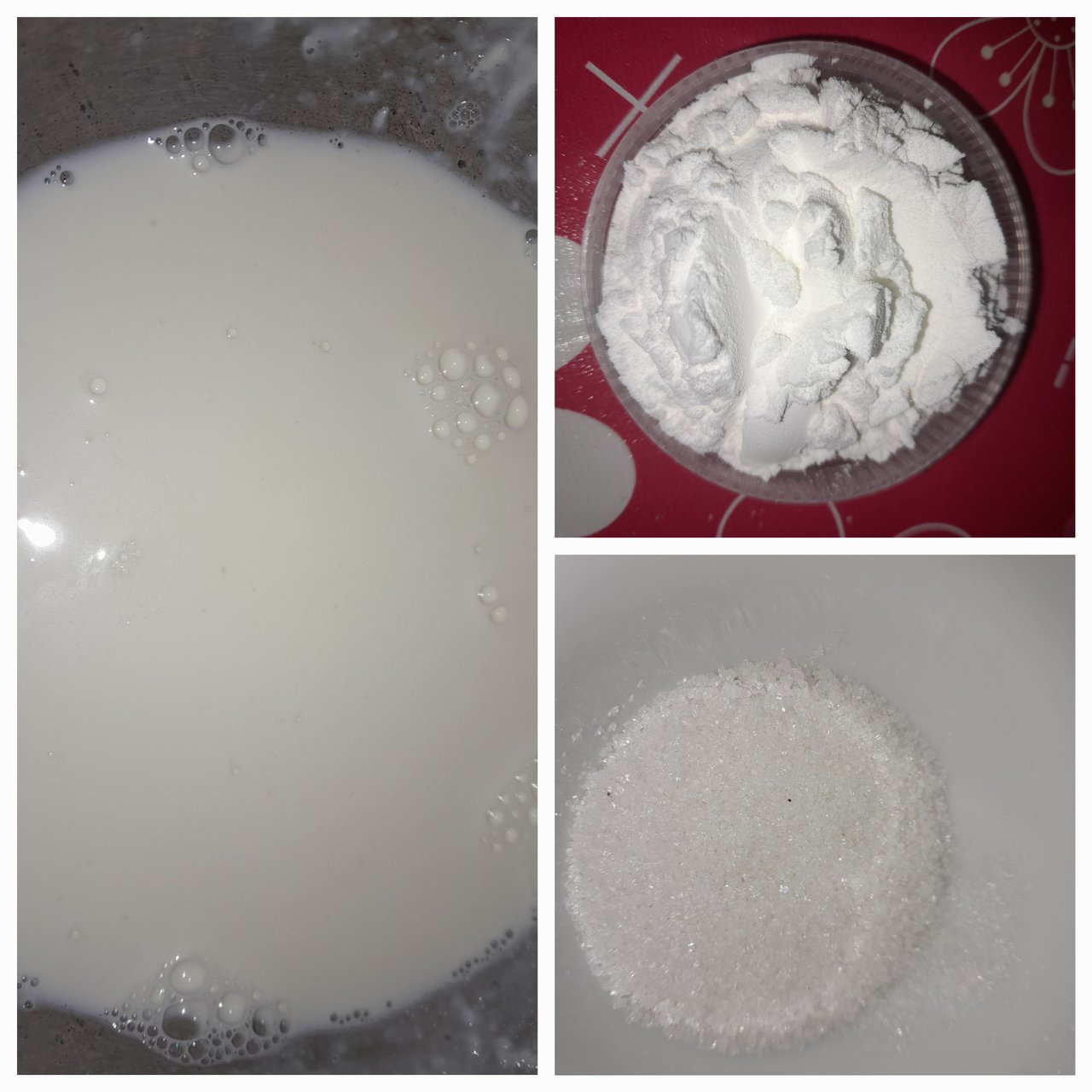 Liquid milk, cornflour, vanilla essence, food colouring.