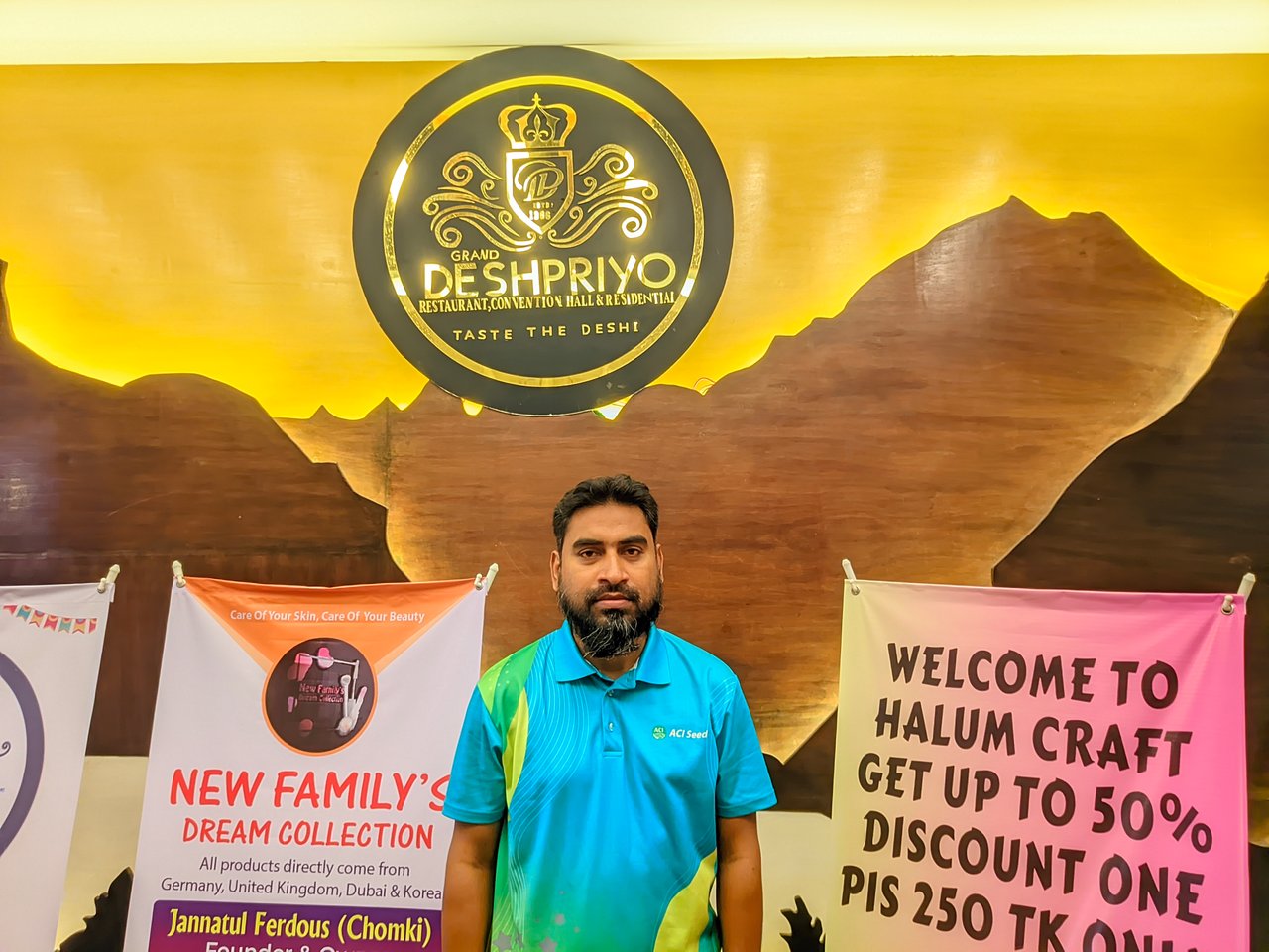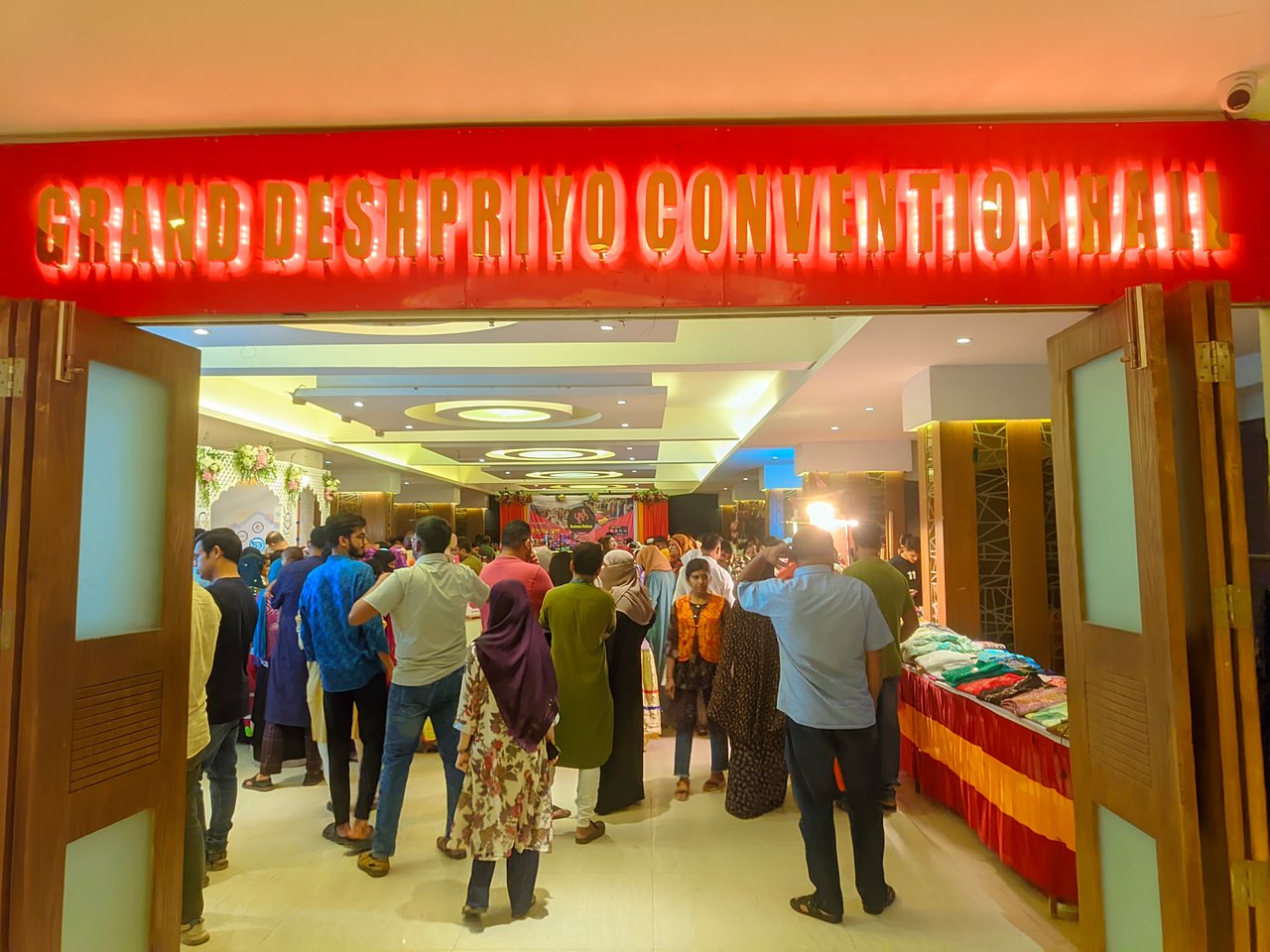 First, you have to reach Comilla city, which is 90 kilometres away from the capital, Dhaka, by bus. Then, from the Kandirpa roundabout in the heart of Comilla city, you can take the elevator to the third floor of the Top Ten Fashion Building on Laksam Road and reach the Grand Deshpriyo Convention Hall. There is a big banner of the convention hall in front of the Top Ten Fashion Building. In addition, there are arrow-marked directions to the convention hall in front of the elevator. Especially at night, the convention hall is decorated with lights. Today, I went to the third floor in the elevator and saw a lot of visitors.