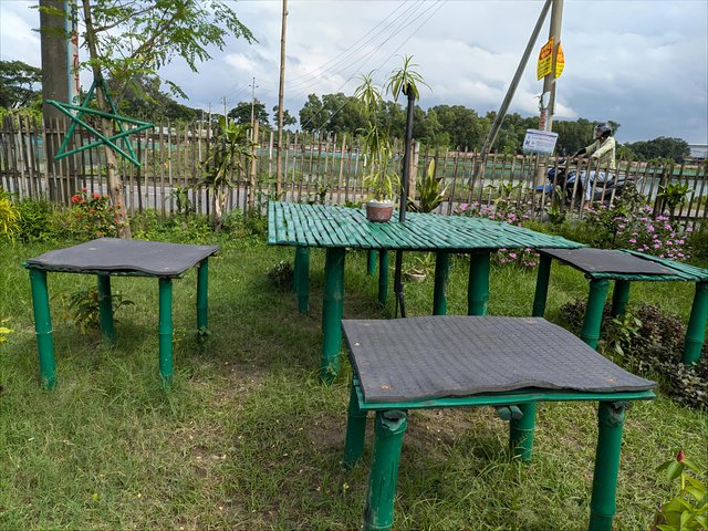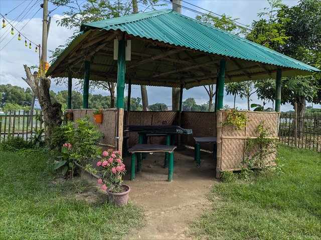 A room has been made of bamboo and can seat 4 people inside. But most people prefer to stand outside and drink coffee. There are also four tables here. In the middle of the tables, there is a water line. There are numerous tables and chairs on the banks of the pond and there are various arrangements for sitting in the open space. However, most people prefer to drink coffee in the open space by the pond.