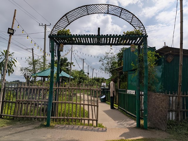 The cafe here is made of bamboo, so the entrance is also made of bamboo. The upper part of the gate is made of bamboo poles. Small lamps have been installed in the lower parts. The light of these lamps makes the gate look very beautiful at night. Also, large bulbs have been installed at the entrance. Two artificial bird nests have been made on both sides of the gate. An attempt has been made to portray the rural environment through these nests.