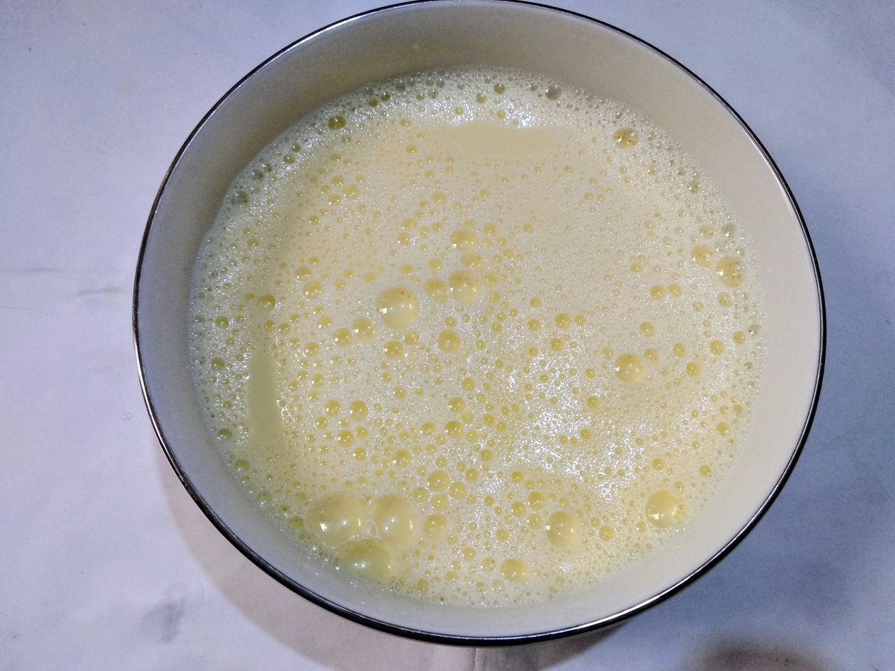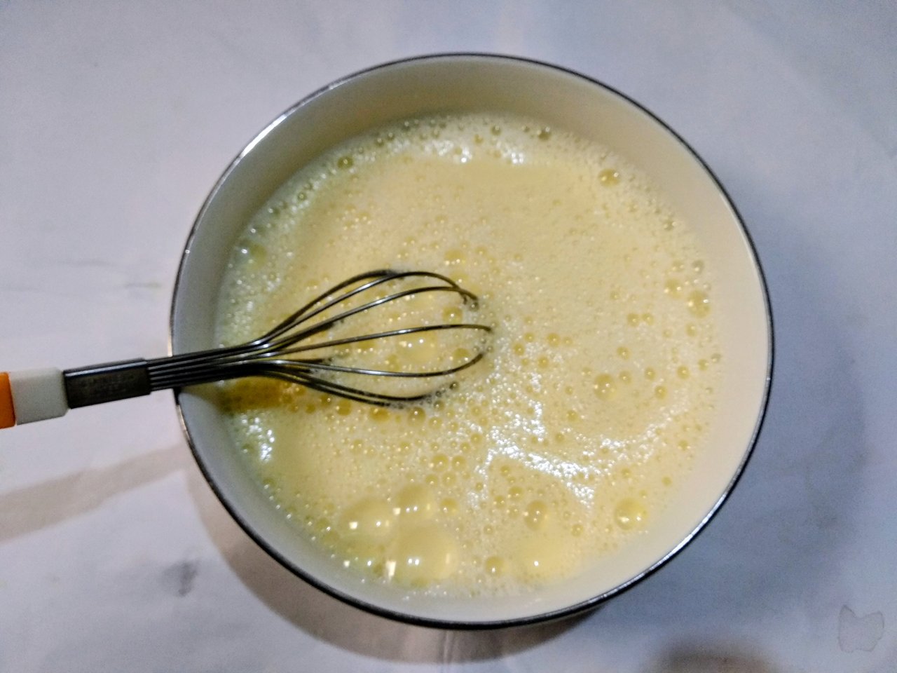 Now I will take the pot in which I will steam the pudding and pour the egg-milk mixture into that pot.