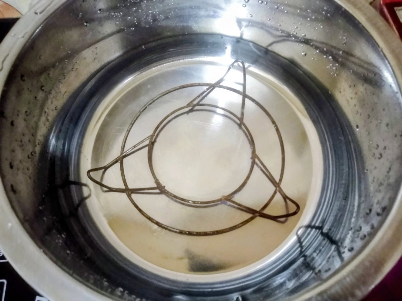 Now I will take you a big pot. I will put enough water in that pot and put a stand in it. Then I will put the pudding mold in it and put the lid on it. Now I will put the lid on the big pot and wait for about 30 to 40 minutes for the pudding to steam.