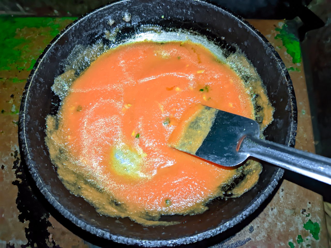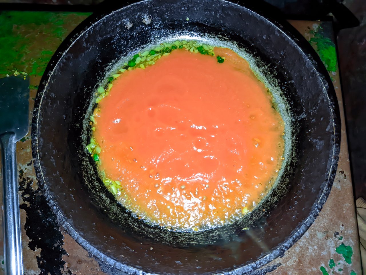 Now place a pan on the stove and add some oil to it, then add the chopped ginger and chilli and fry them well. Once the chopped ginger and chilli are fried, add the tomato paste.