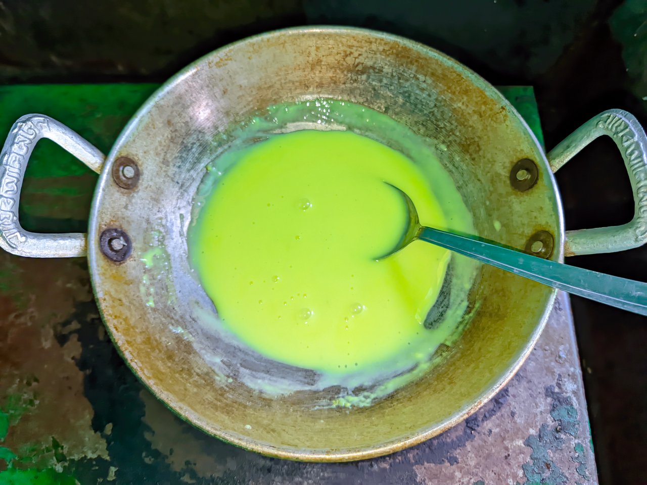 Now when the milk kept on the stove gets a little hot, I will add the milk mixed with custard powder to it and keep stirring continuously. When I see that the milk has thickened, I will take it out and pour it into a bowl and leave it to cool for a while.