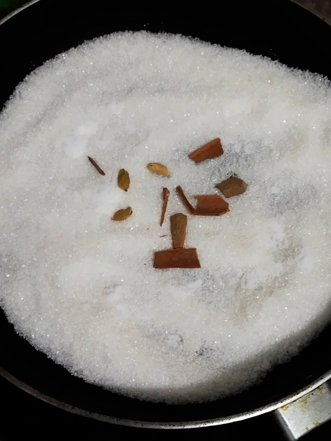 - Then I put a frying pan on the stove and added a little sugar to it. Then I added some hot spices.