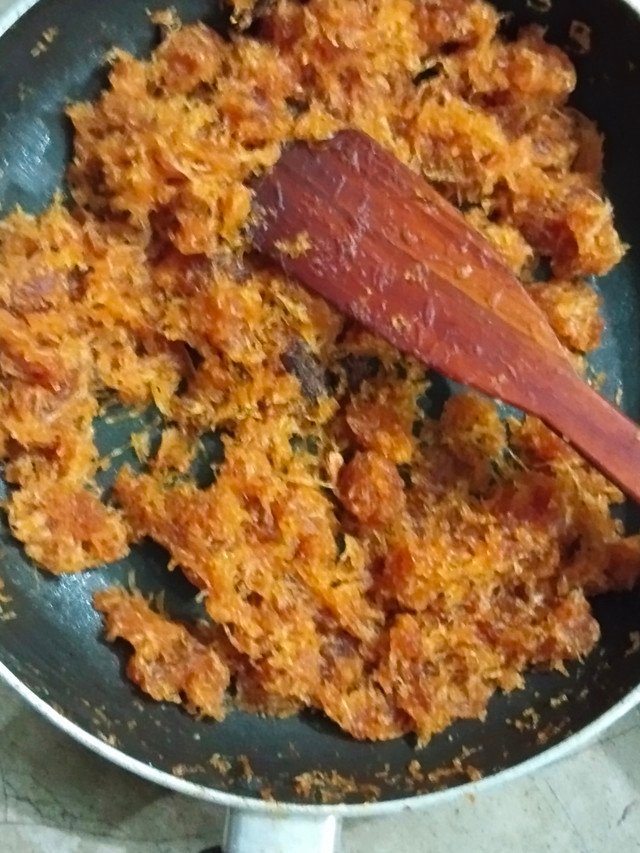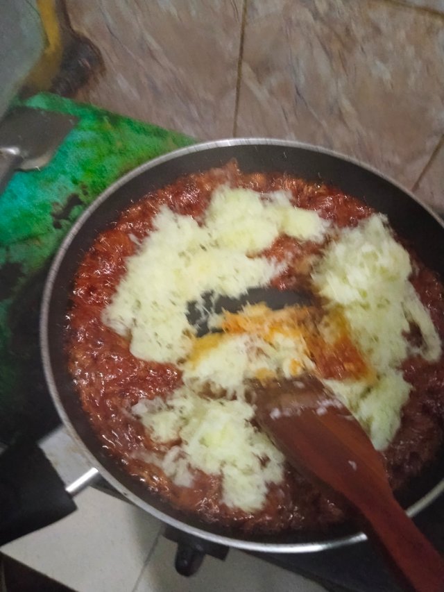 - Then I added the boiled papayas to it. Then, stirring well, I made it look completely reddish.