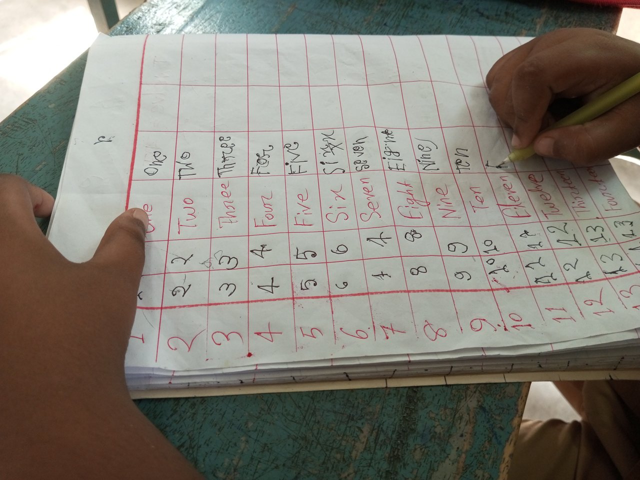 Then there is a child in the play class, his class was taken. The boy can write very beautifully. Here you can see that I have written with red ink. And he is writing beautifully with black ink. Many people knew that the boy would not be able to do anything because he is mute and deaf. However, now he is almost able to hear and understand. All of you should pray for the boy. May he be able to do better in the future.