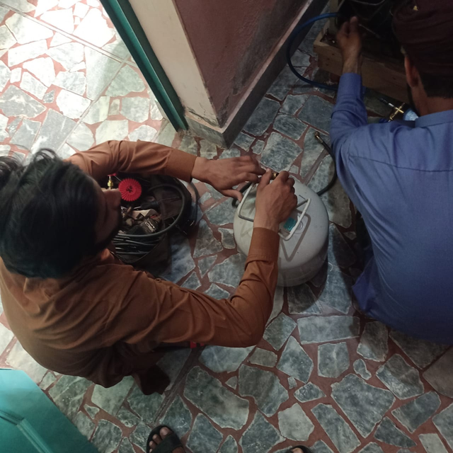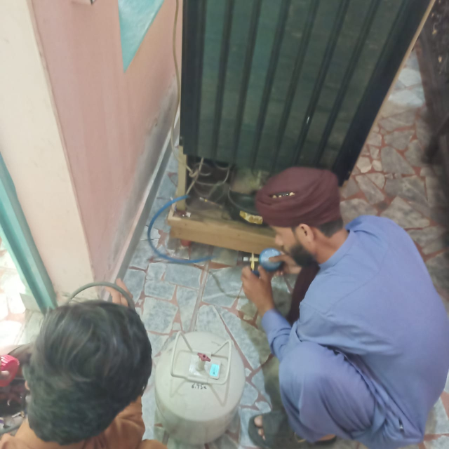 The cooling in the lower portion of our freezer had decreased because the gas inside it had decreased. When there is a shortage of gas, there is no cooling. So I went to the market to get the two craftsmen who would fill the gas. I brought them home on a motorcycle and had them check the freezer. They told me that the gas was really low, so they put their own cylinder in and filled it with gas.