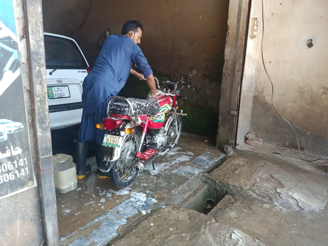 Usually, they charge 100 to 150 rupees for washing a motorcycle, but they charged 250 rupees because they provide the best service. They clean each item very well, and then they also apply a shito to it, so the motorcycle looks new in an instant. That's why I also got the service from them.