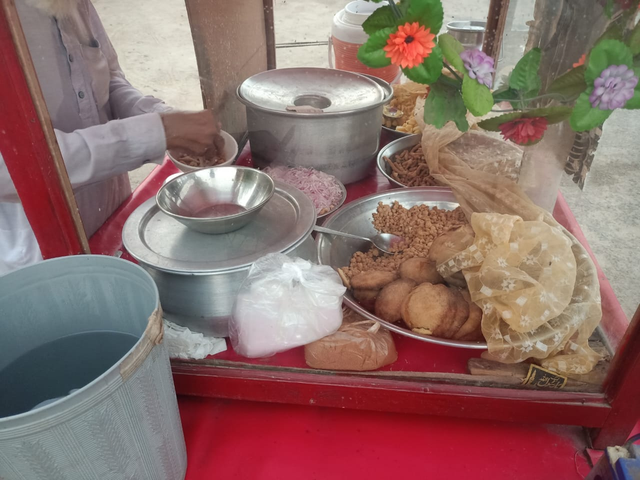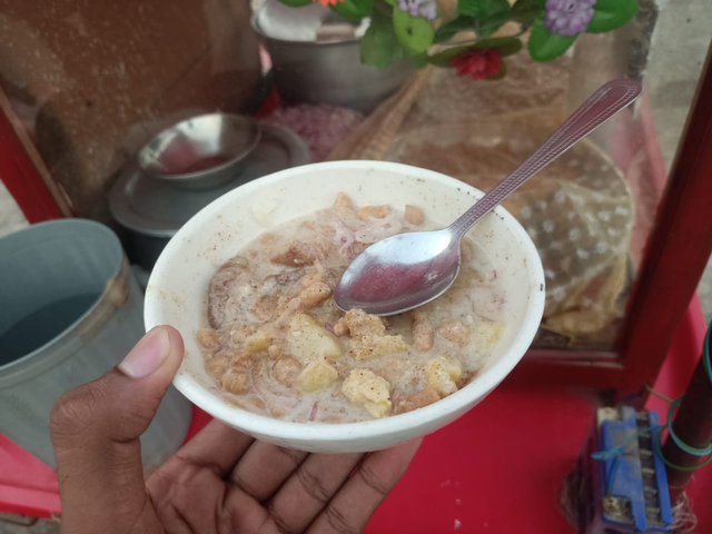 This is an elderly man, and he has his own cart, which he sells by walking around, sometimes at stops and sometimes not. The products he has are of very high quality, so everyone likes to eat from him. So I also ordered a 100-rupee bowl of Dahi Bhala and sat there and ate it.