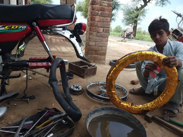 The tire and tube were in such a critical condition that it was no longer possible to keep them, so I went to another shop nearby and bought a used tight tube from there. After buying the tight tube, I went back to the same shop and had it repaired, and they put my new tube in, after which I left.