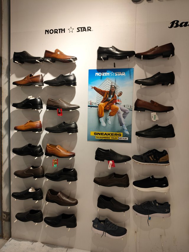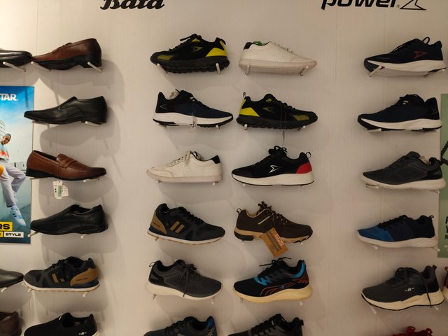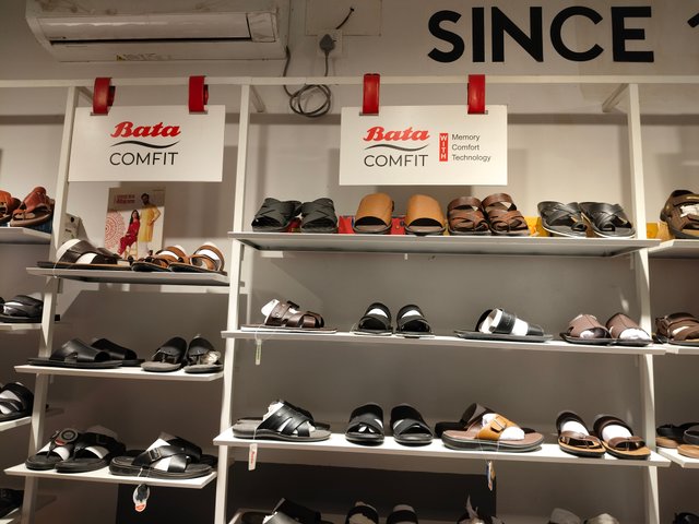 When you enter the Bata showroom, first on the right hand side you can see rows of sandals and different models of shoes for adults. Which are marked differently and have tags on them, so that a person can easily find these shoes. Next to them we see sports shoes, these shoes are usually purchased by young boys. There are two types of sports shoes, one is power and the other is bata.