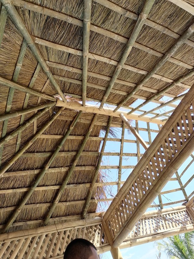 He has a bungalow but the roofing was not yet done. They are using Cogon grass to make a roof.