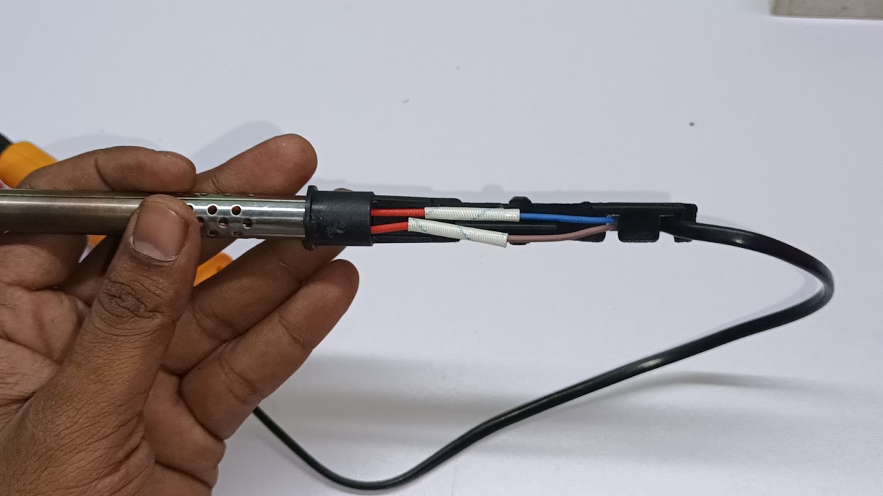 Now you can see that I have taken the new coil here and inserted it inside the body of the soldering iron, and two wires are coming out. Now I will join it with the previous input voltage wire.