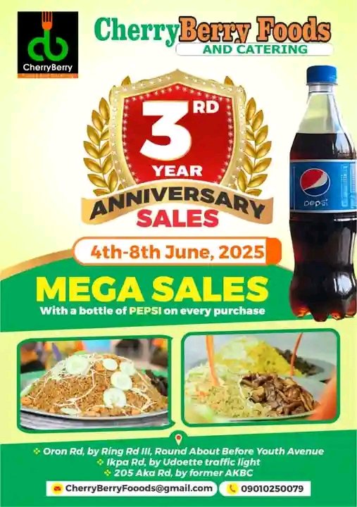 Cherry foods have been in existence for more than 3 years, their anniversary was just some months ago. It was really a big celebration that covered the entire people in the state. Thier purchase was with a bottle of pepsi to mark their 3 years in the business. The founder being Linda ekwere saw a vision of making available evening delicacies mainly for people who enjoy hot and sumptuous delicacies.