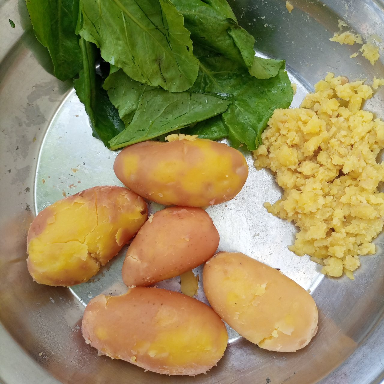 Now that the potatoes and Chickpeas were boiled, I peeled the potatoes and put the lentils in a pan and finely chopped them. I also washed some spinach leaves and put them with them so that the taste of this recipe could be further enhanced.