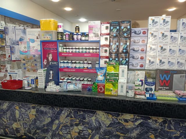 Just by looking at the exterior of this pharmacy, you will get an idea of what services are available inside it. On the one hand, there is a pharmacy here, where you can get all kinds of medical medicines. On the other hand, here you get to see a surgical store, in which you can get all the items that are used for disabled people or sick people. Along with the pharmacy, it is also a laboratory; they perform all kinds of tests for you. There is also a She's shop, where all women's items are available.